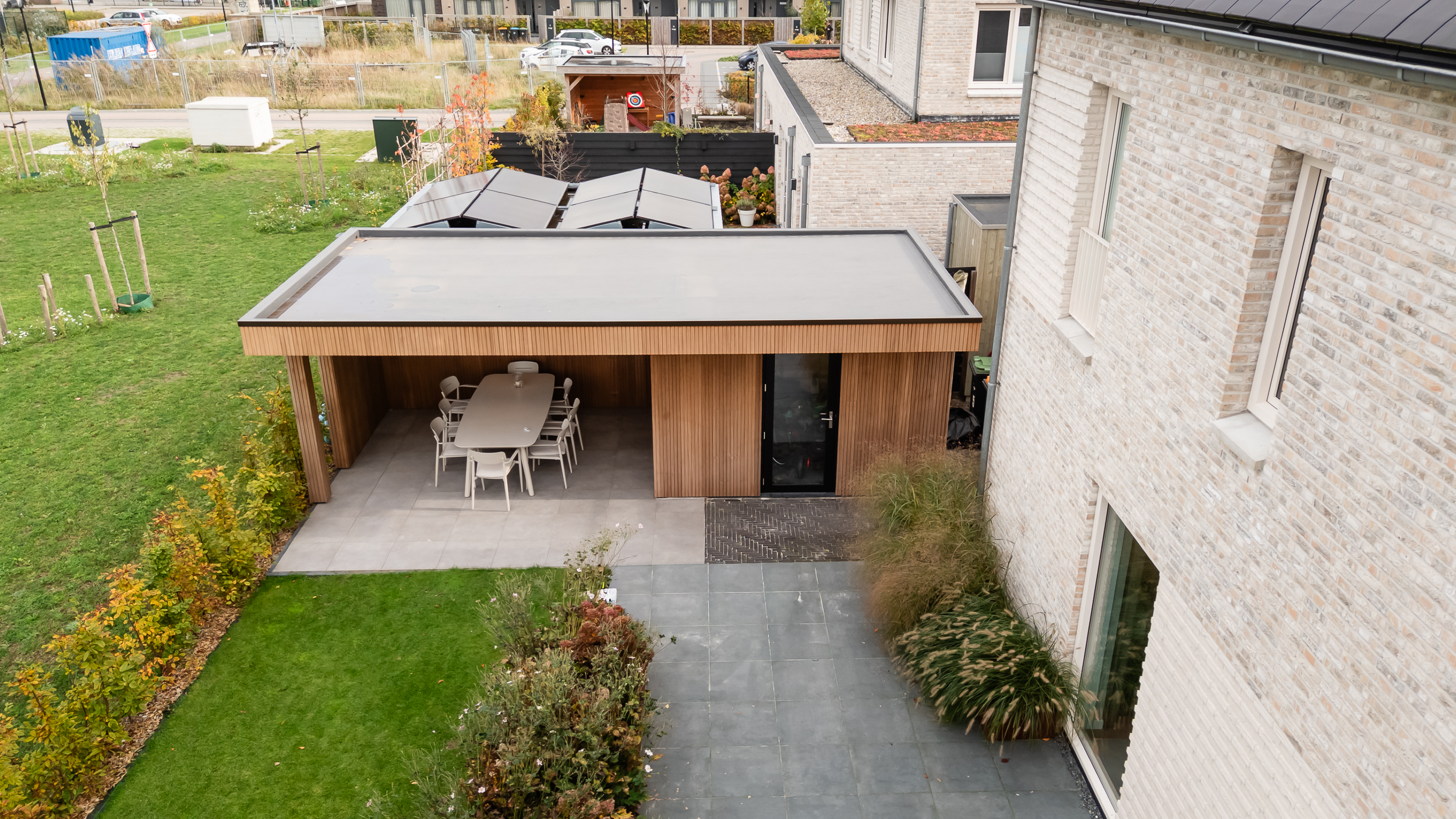De strakke detaillering laat zien dat er veel aandacht is besteed aan montage en afwerking. Door het Ayoushout krijgt de veranda een warme uitstraling die perfect samengaat met het moderne ontwerp.