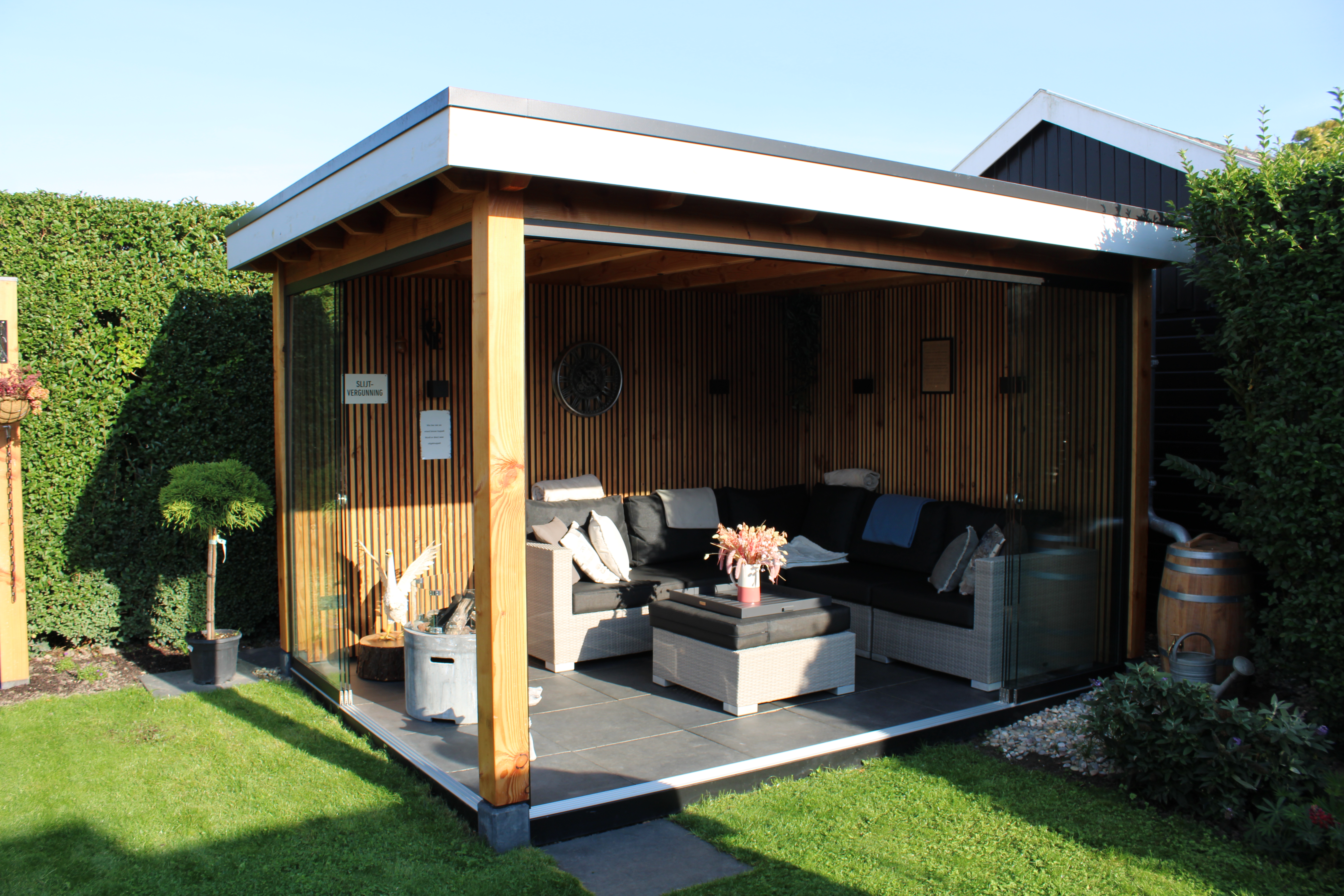 Aan de voorzijde en één zijkant zijn AL24 maatwerk glasschuifwanden geplaatst. Deze staan op een funderingskoker, zodat de rail stabiel blijft en niet kan vastlopen bij eventuele verzakkingen. De schuifwanden sluiten de ruimte goed af, maar laten het zicht op de tuin volledig vrij.