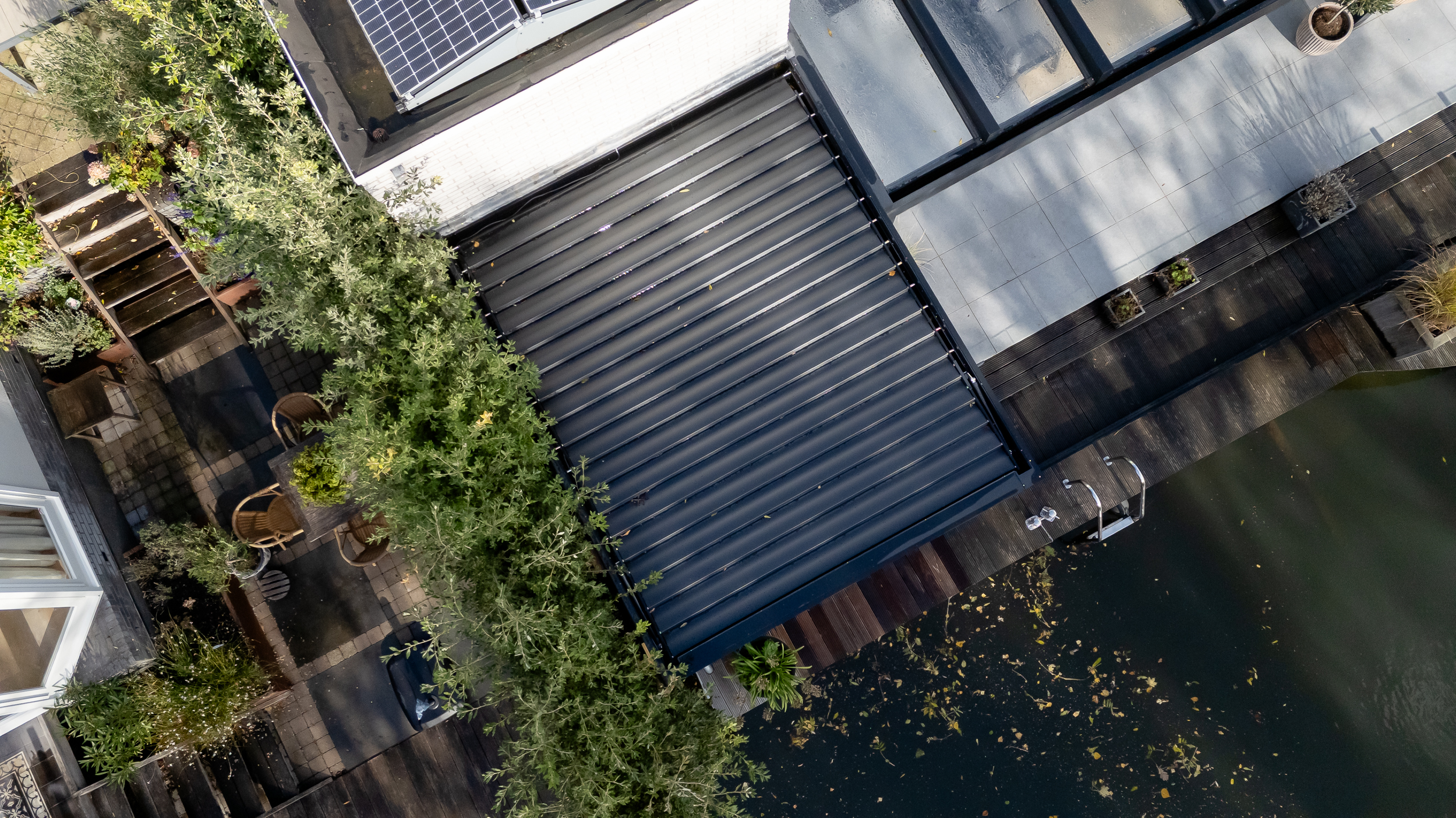 In Leerdam, direct aan de Linge, heeft Gervé een Alya lamellendak van Cornels geplaatst in de afmeting 265 × 393 cm. De compacte maat past perfect bij de woning en biedt toch voldoende beschutte ruimte om het hele jaar door comfortabel buiten te zitten. Het aluminium dak bestaat uit kantelbare lamellen die eenvoudig open en dicht kunnen. Hierdoor kan het licht, de warmte en de ventilatie onder de overkapping precies worden geregeld, passend bij het wisselende weer langs het water. Aan één zijde is een Varisol screen F513 gemonteerd. Deze screen houdt de laagstaande zon tegen, biedt extra privacy en dempt de wind zonder het uitzicht volledig te blokkeren. Wanneer het screen omhoog staat blijft de wand volledig open en behoudt de buitenruimte zijn open karakter. Rondom de goot is een ledstrip geïntegreerd. De verlichting is onopvallend verwerkt in het aluminium en geeft ’s avonds een gelijkmatig en sfeervol licht langs de randen van het dak. Hierdoor blijft het terras ook na zonsondergang warm verlicht, zonder zichtbare kabels. Het resultaat is een strak, modern en functioneel lamellendak dat perfect past bij de omgeving aan de Linge, zorgvuldig en vakkundig gemonteerd door Gervé.