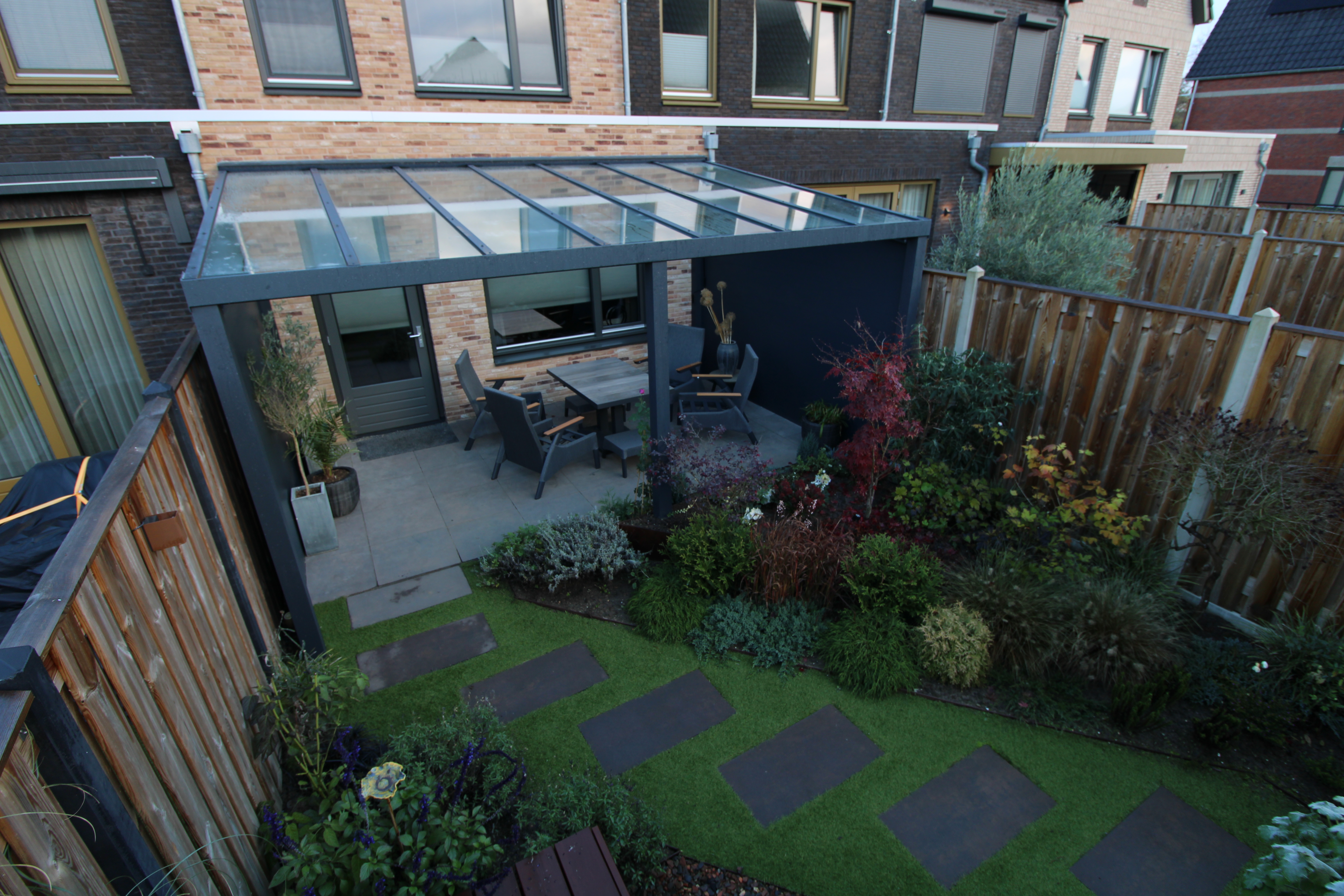 Beide zijwanden zijn volledig gesloten met aluminium mes-groef planken. Aluminium zijwanden vormen een strakke en duurzame afsluiting. De wanden sluiten naadloos aan op de staanders en balken, waardoor één rustige en strakke wand ontstaat. Omdat het materiaal dezelfde structuur, coating en stabiliteit heeft als de overkapping zelf, wordt de hele overkapping één geheel. De wanden zijn volledig onderhoudsarm: aluminium rot niet, werkt niet en blijft jarenlang. Ook bieden ze extra beschutting tegen wind en regen, waardoor de zithoek onder de overkapping meer comfort krijgt. Door de vaste panelen ontstaat bovendien meer privacy, zonder dat de overkapping gesloten is. Aluminium zijwanden zijn daarmee een praktische keuze wanneer je een duurzame, winddichte en visueel strakke afwerking zoekt die perfect past bij de rest van de overkapping.