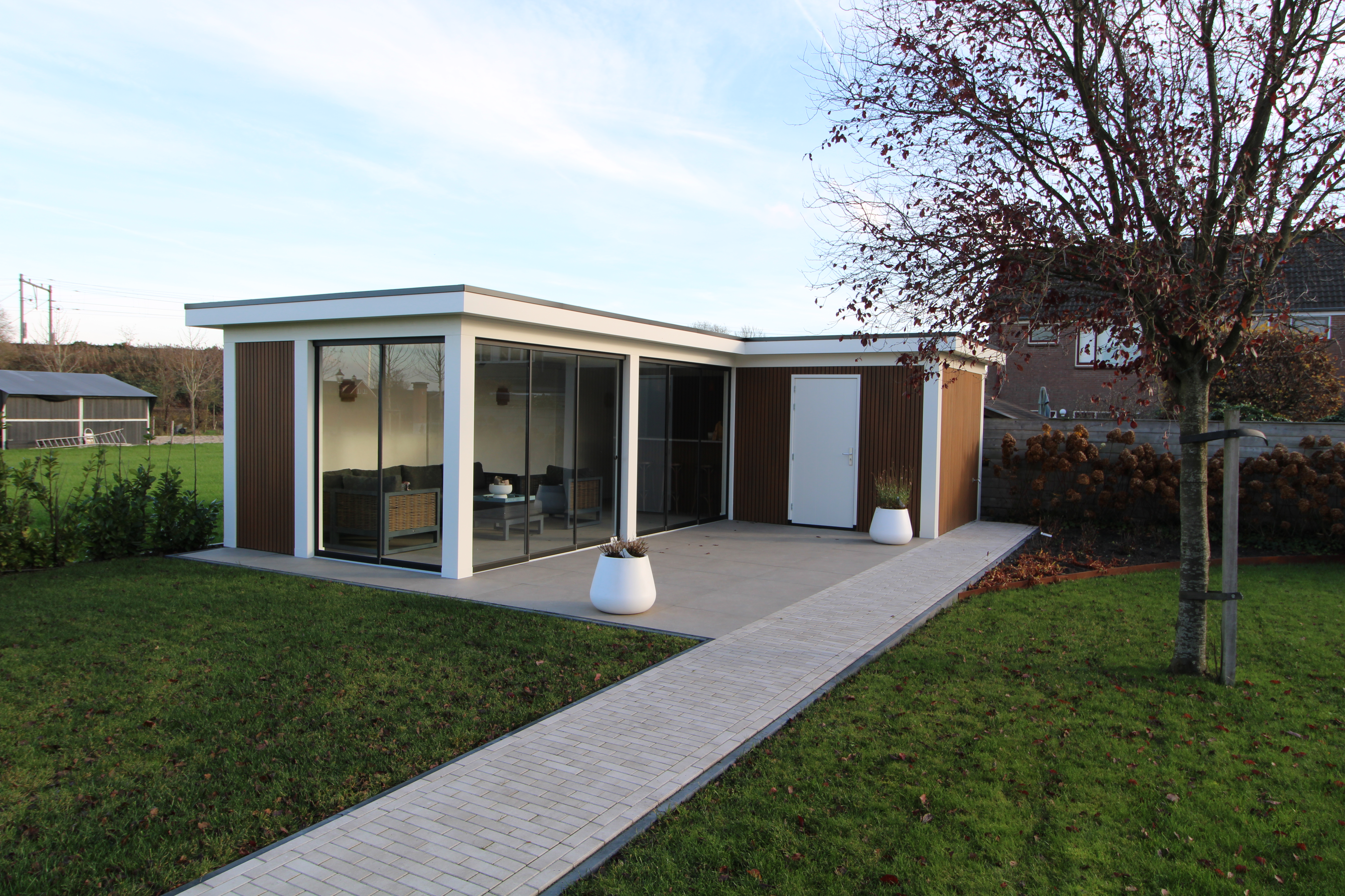 De strakke detaillering laat zien dat er veel aandacht is besteed aan montage en afwerking. Door het Ayoushout krijgt de veranda een warme uitstraling die perfect samengaat met het moderne ontwerp.